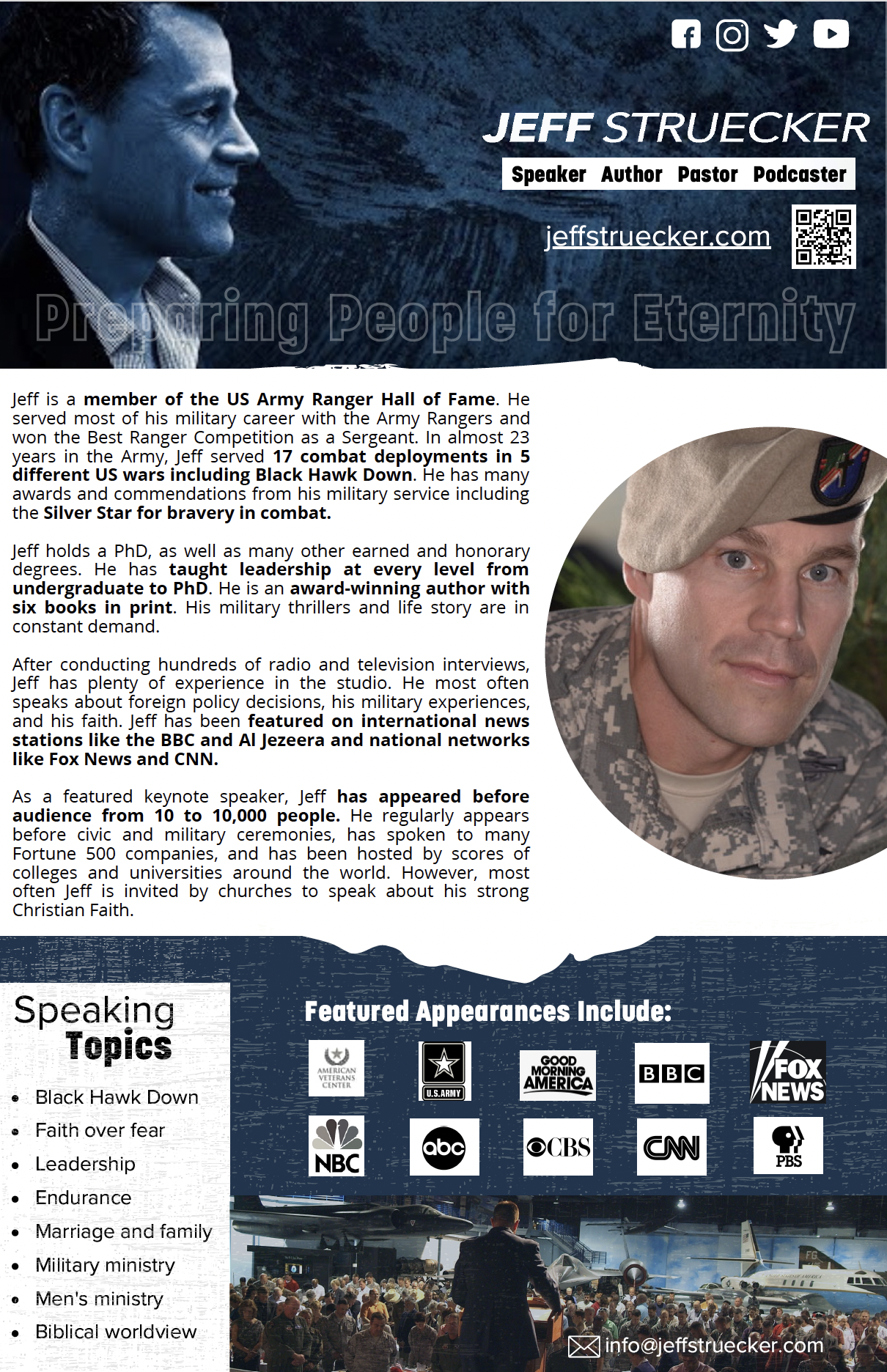 He served for ten years in the 75th Ranger Regiment in positions from Private to Platoon Sergeant. While serving in this unit, Jeff competed in and won the David L. Grange Best Ranger Competition in 1996. He taught ROTC at the University of Louisville and was recognized in 1998 as the US Army ROTC, Noncommissioned Officer of the Year. Jeff spent his final ten years in the US Army serving as a chaplain in Airborne and Ranger units.